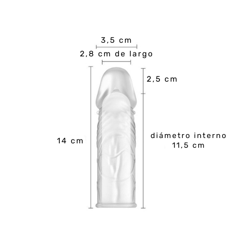 Con esta funda para pene, lograrás darle a tu miembro una extensión de 2,5 cm, proporcionando una estimulación vaginal placentera gracias a su cuerpo texturado. Su diseño transparente y material hipoalergénico y flexible aseguran una experiencia cómoda y segura.